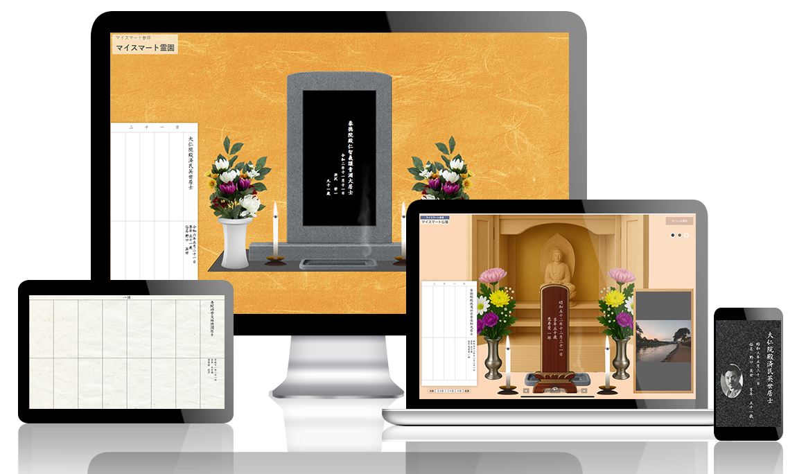 マイスマート参拝は、お墓参り(お墓、霊園、納骨堂)に行けなくても、ご自宅で簡単にお参りができるツールです。普段お使いのパソコン、スマートフォンやタブレットにお墓と同じ「○○家之墓」と表示し、その他にも「お戒名(ご法名)」の表示、「墓誌」、「次回の法要日時等の案内」など、遺影や故人の思い出の記録などのメモリアル演出だけでなく法要の管理を行うことができます。